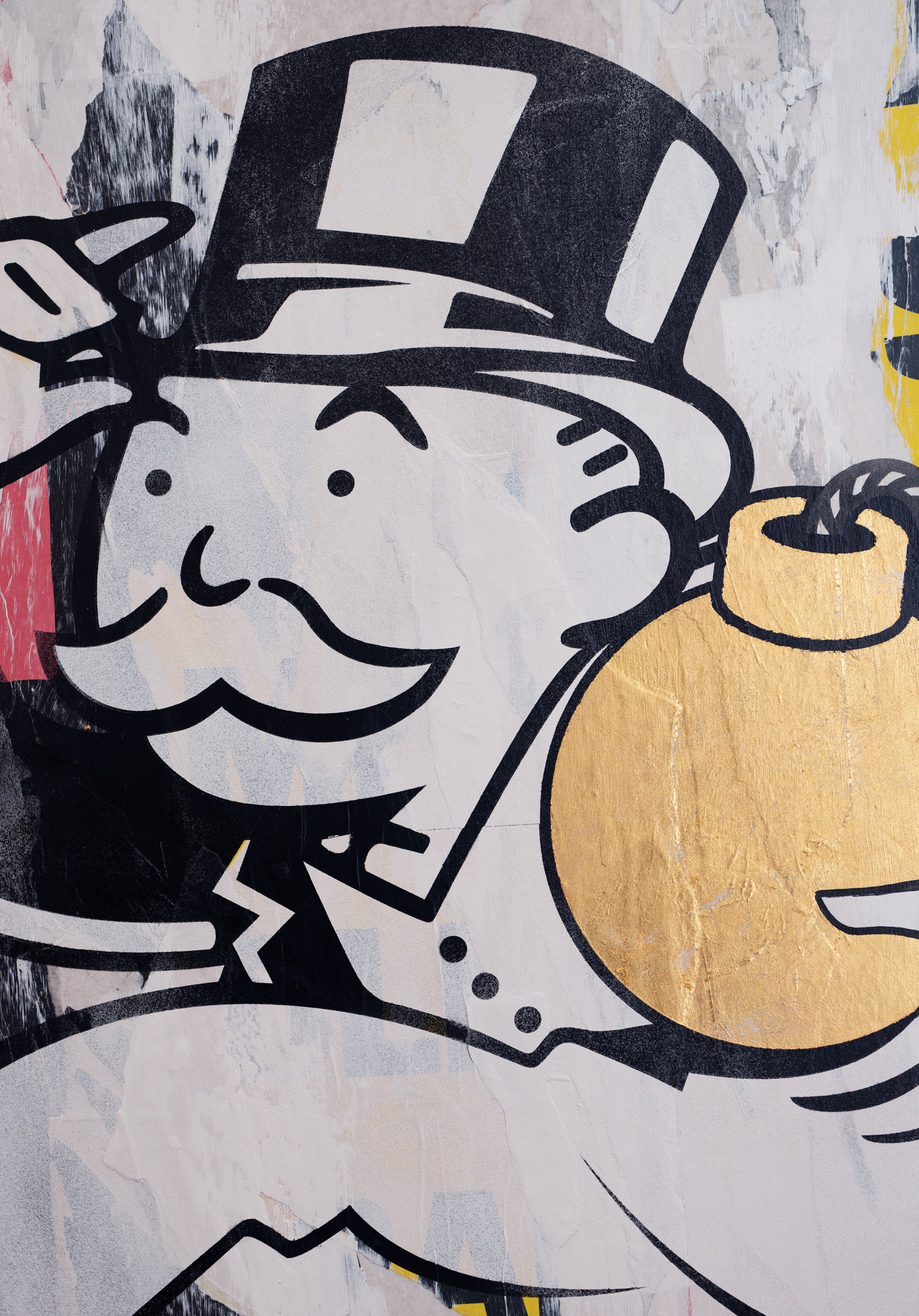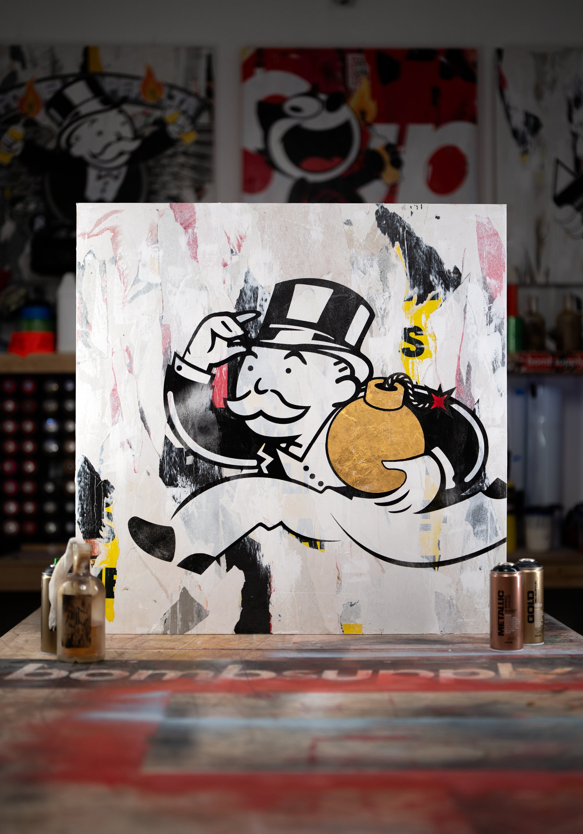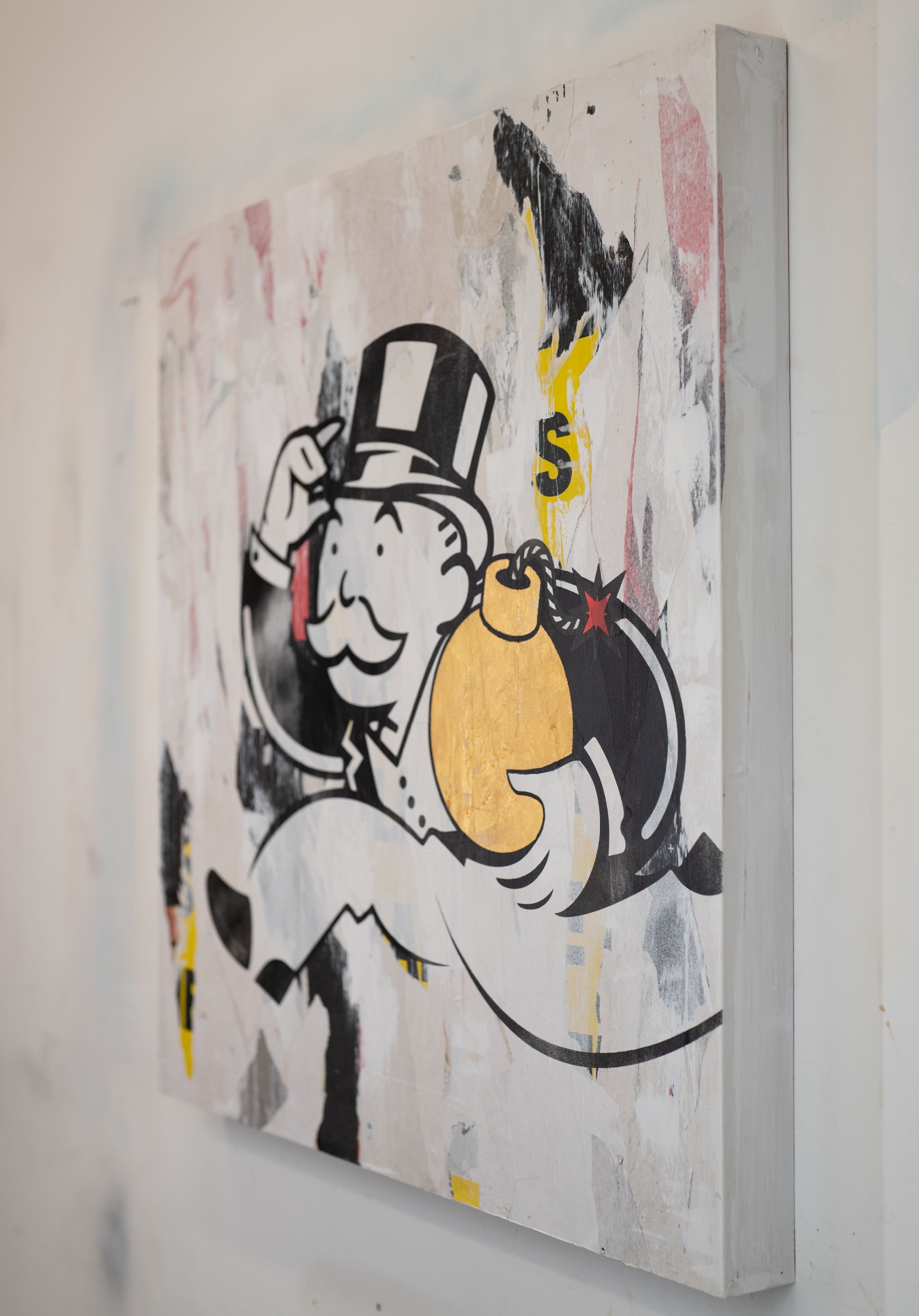 Capitalism. Great. American. Capitalism. 36" x 36" mixed media on wood panel. Lightweight cradled wood panel, built by hand. Covered in street posters salvaged from the streets of NYC. The foreground is spraypaint, a little bit of marker, and 24k gold leaf for the bomb.