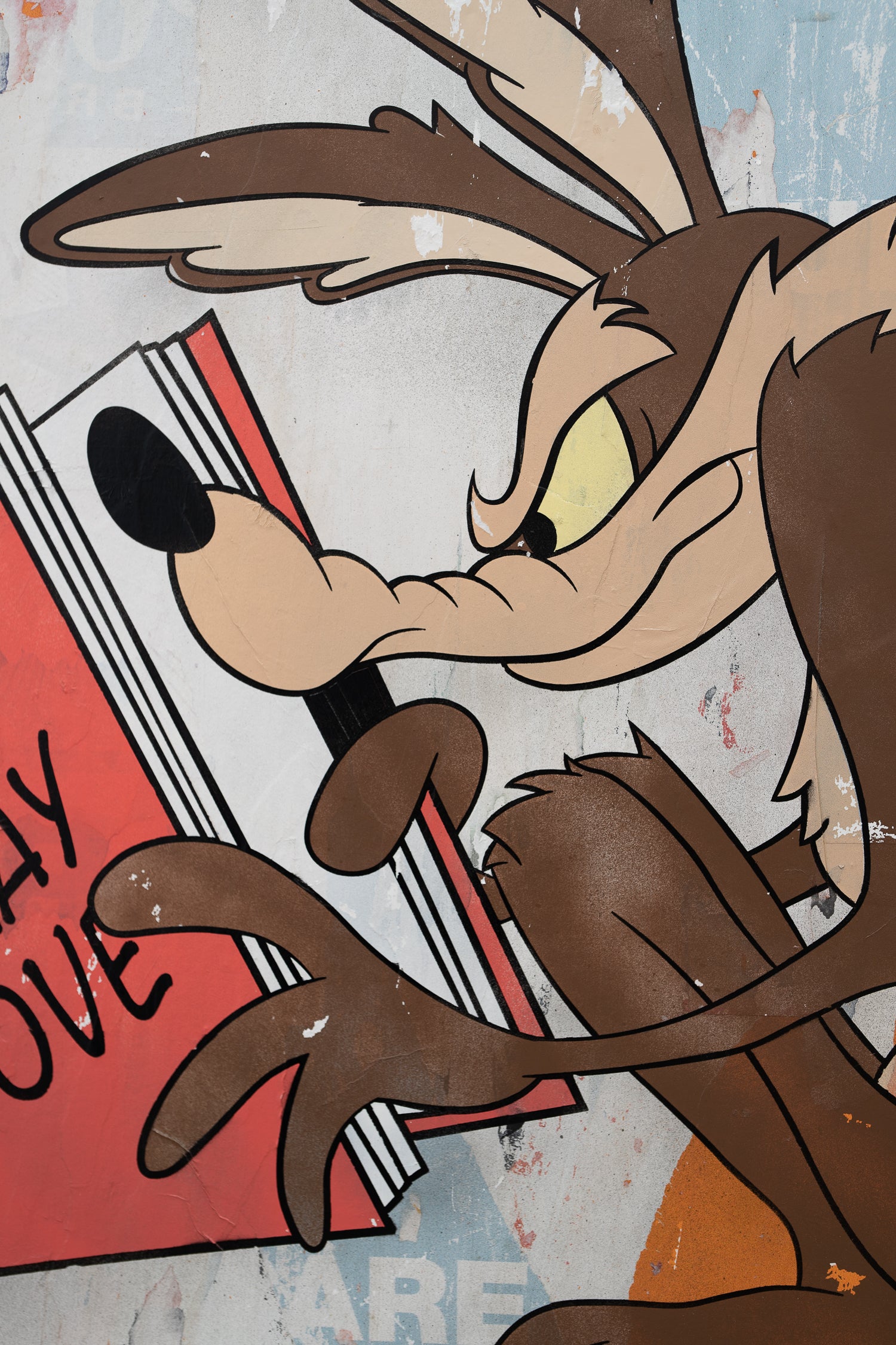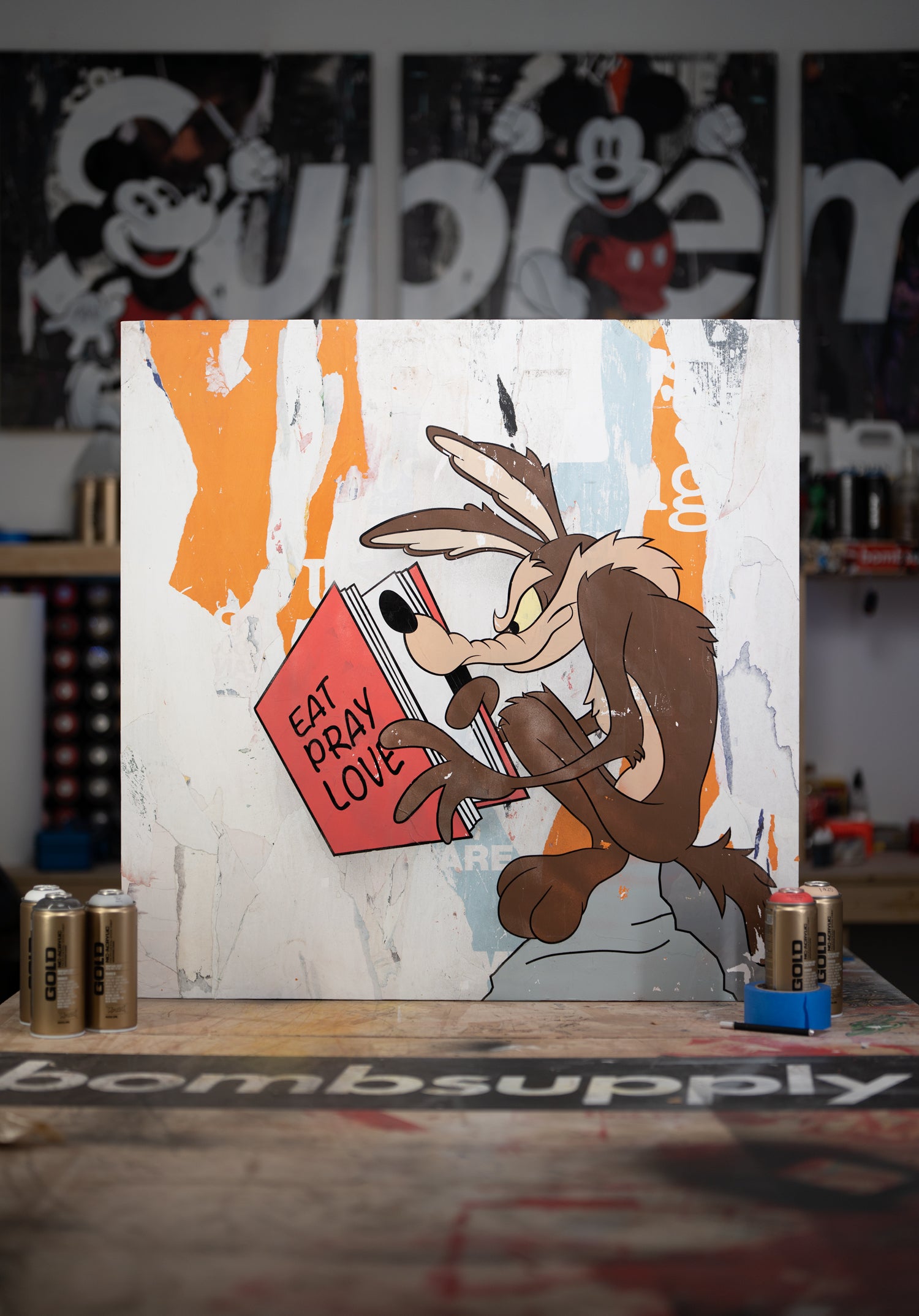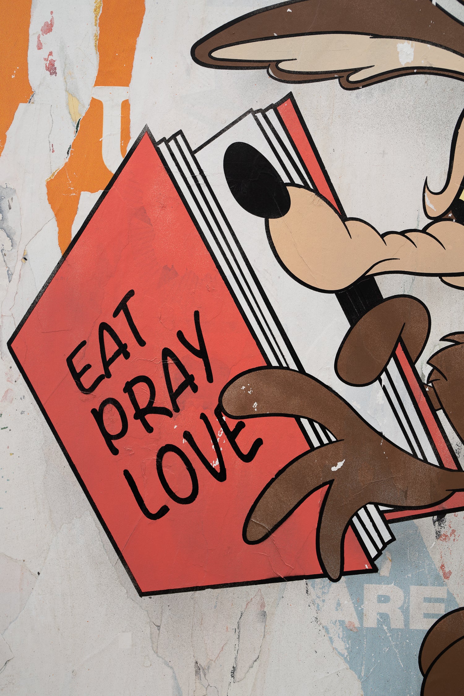 In his hand, Wile E. Coyote holds a copy of the book "Eat, Pray, Love" by Elizabeth Gilbert. The book is open, and he appears deeply engrossed in reading it.